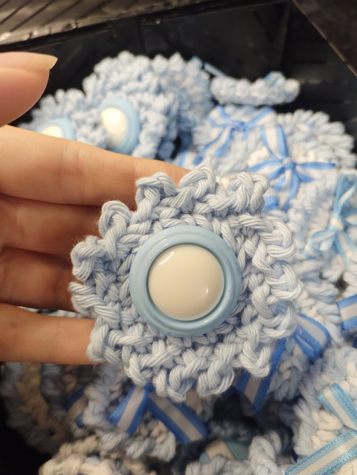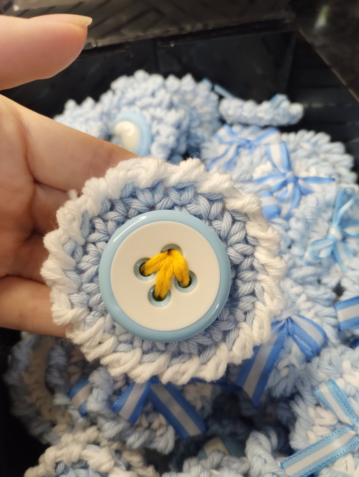 Modelos surtidos escarapelas GRANDES 4/5CM, tejidas a mano, diseños únicos, con botones cintas y el prendedor
